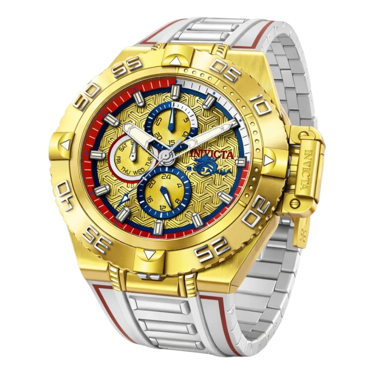 Este impresionante reloj INVICTA Subaqua cuenta con un movimiento de cuarzo preciso así como una caja de acero y oro. Su carátula metálica dorada|roja|plateada|azul|está encerrada por un cristal mineral altamente protector. Este reloj está rematado con una banda roja y blanca intensa, y ofrece una resistencia al agua de 100 m.